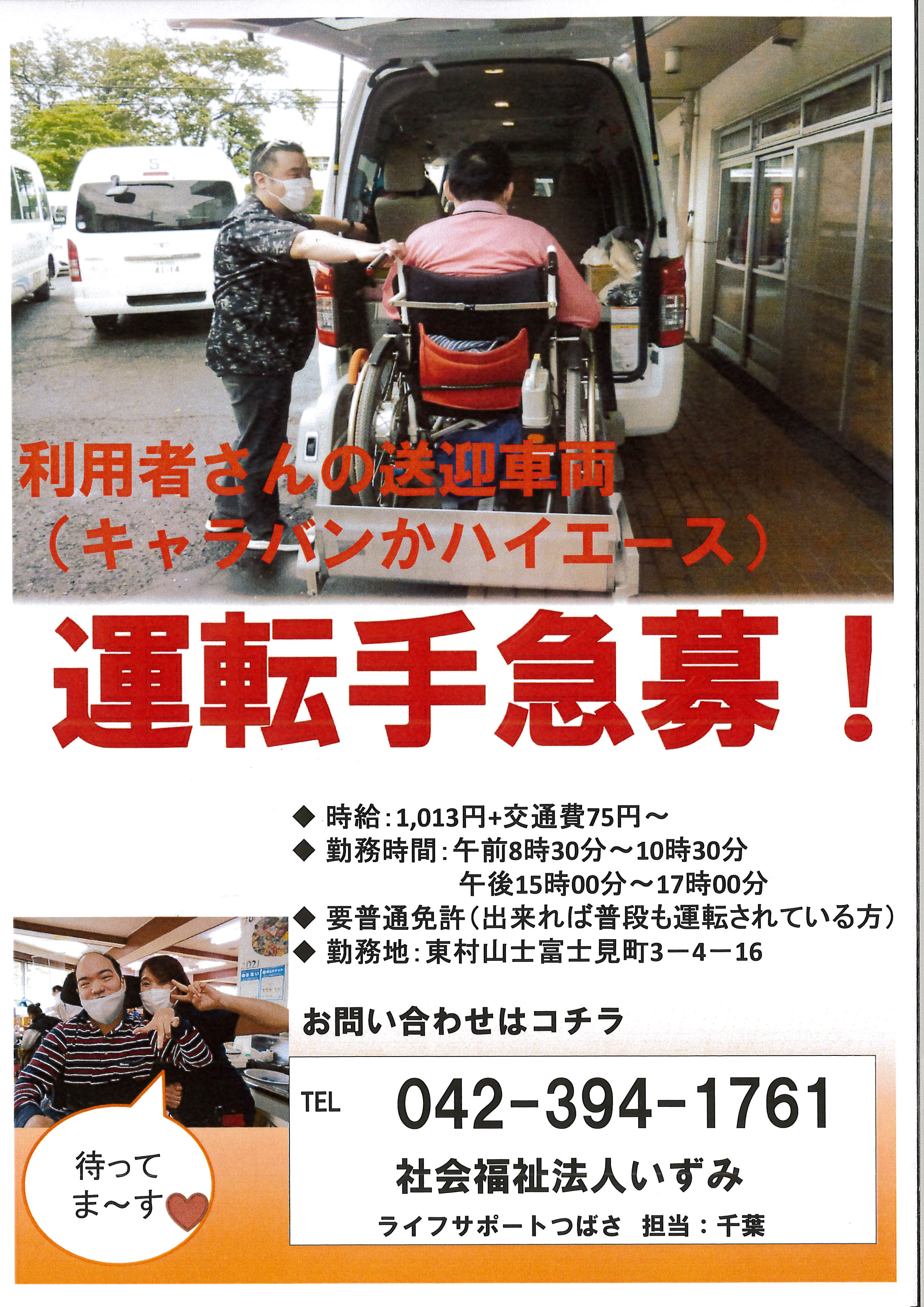 | 連絡先 | ライフサポートつばさ 担当:千葉 042-394-1761 又は応募フォームにご記入の上送信ください。後ほど、担当者よりご連絡申し上げます。 |